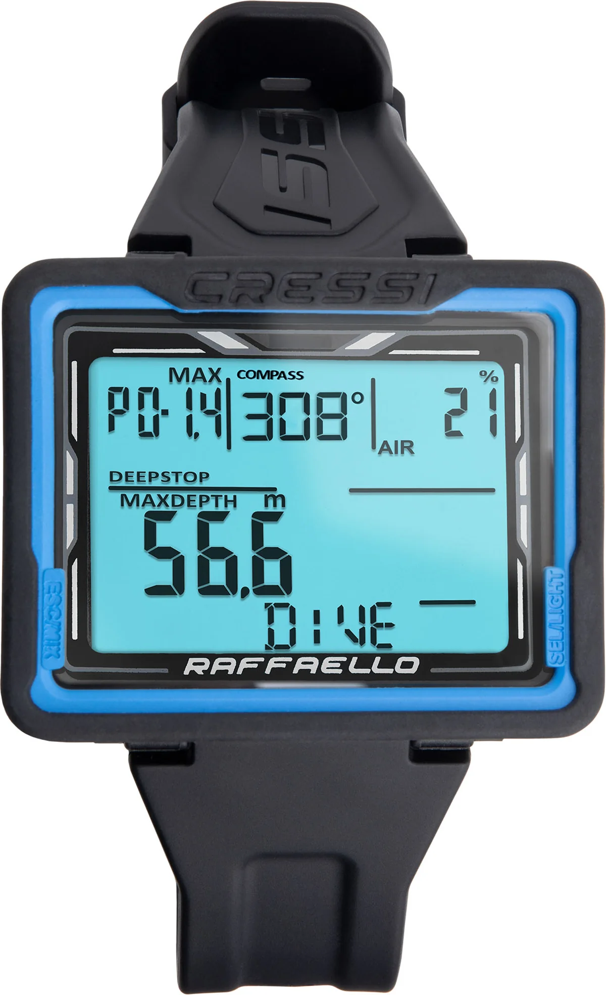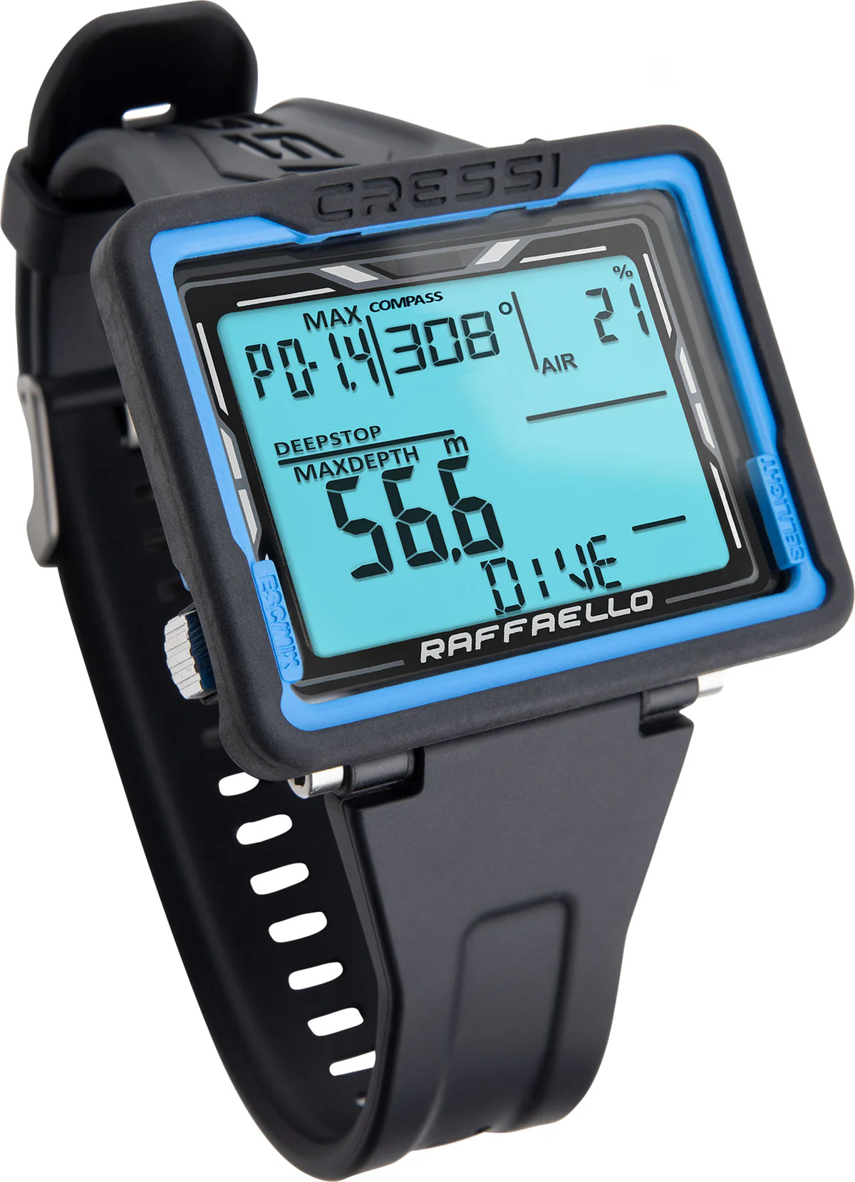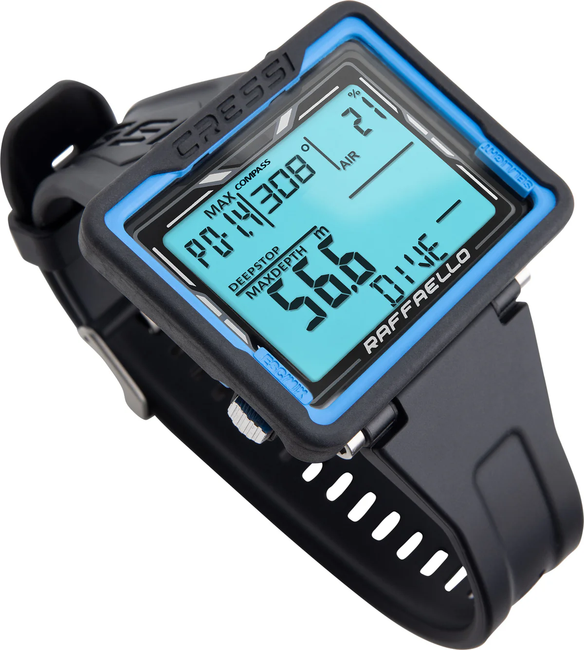 Raffaello is a diving computer with a durable, scratch-resistant body and a large, easy-to-read display. It offers essential dive data, including surface time and desaturation time, with a long lasting battery and user-replaceable feature.