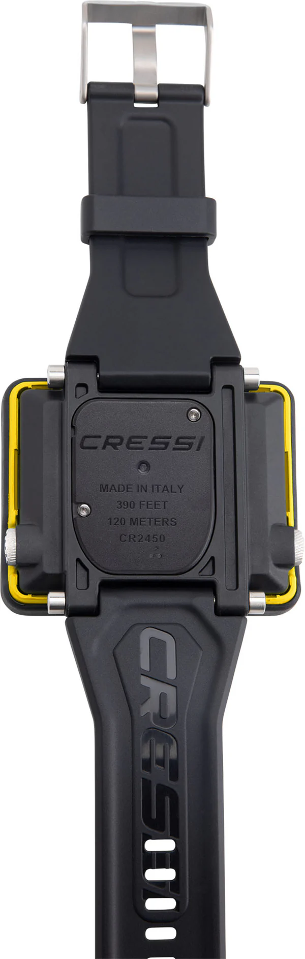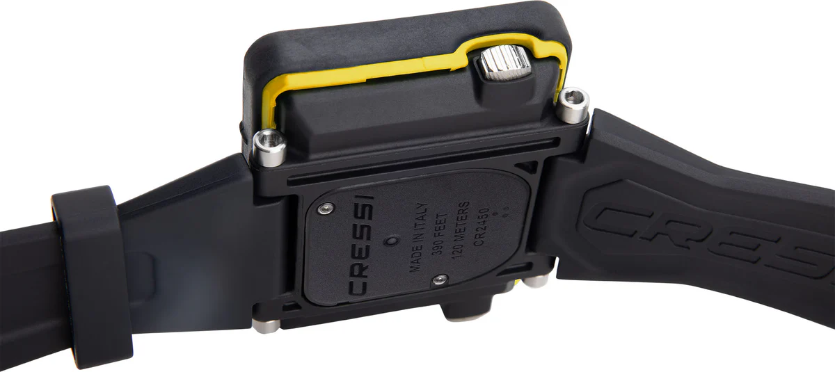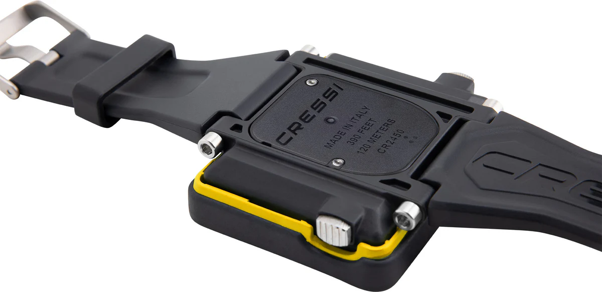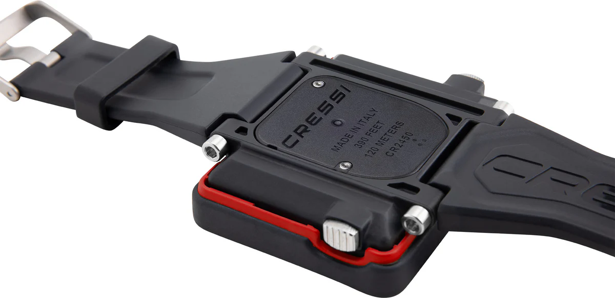 The DIVE program utilizes the Cressi RGBM Algorithm, allowing for precise dive planning alarms for ascent speed violations. The FREE program provides comprehensive data for apnea diving, while the GAUGE program offers essential measurements and resettable chronometers. High contrast display. Very large numbers, position for an easy reading.